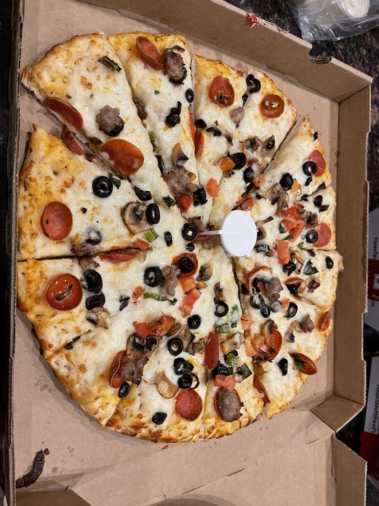 traditional combination our famous pepperoni, italian sausage, mushrooms, black olives, bell peppers, onions & diced tomatoes.